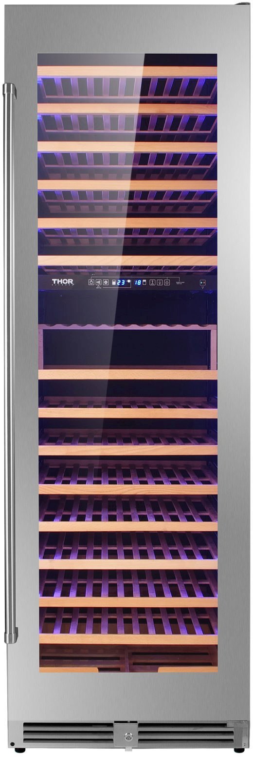 A dual zone wine cooler featuring 162-bottle storage capacity, reversible door, touch control pad, electrical temperature control with led display, door opening alarm and three colors of led illuminating lights.Read More
